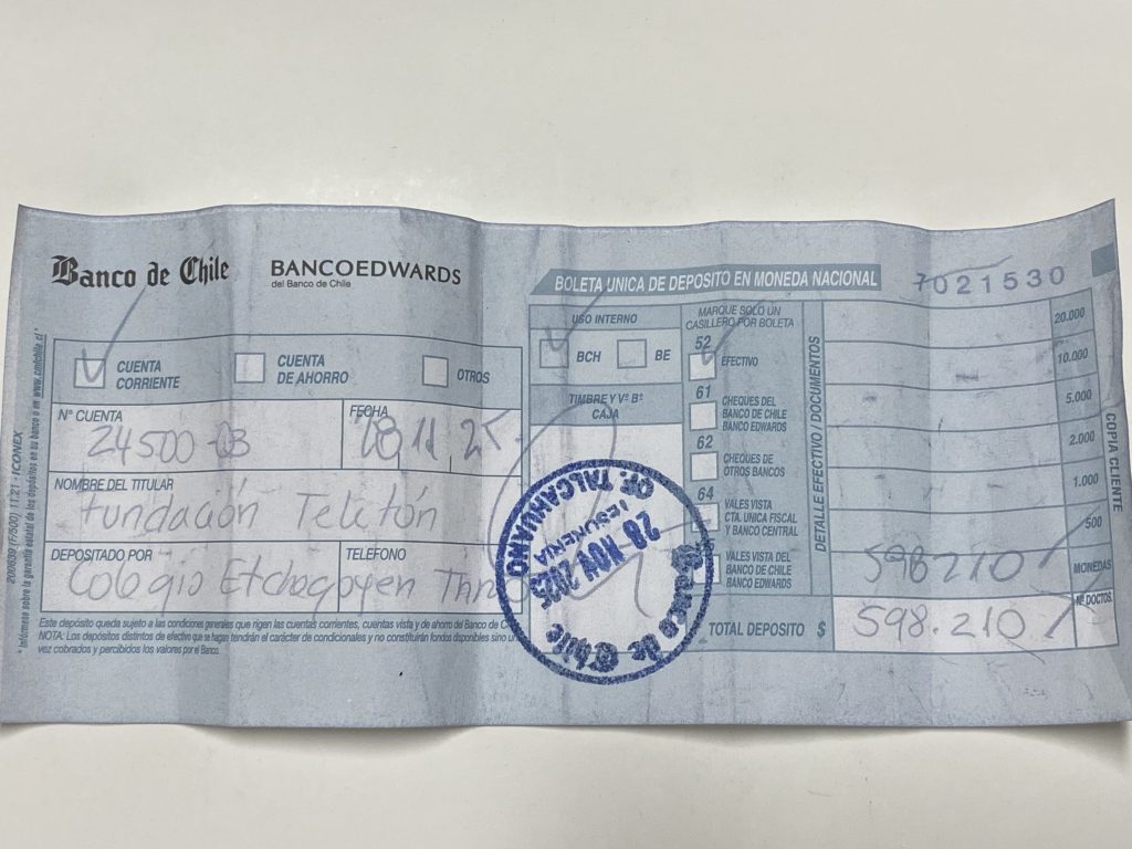 Lo recaudado y depositado a la Campaña Solidaria de la Teletón – Etchegoyen Casa Central